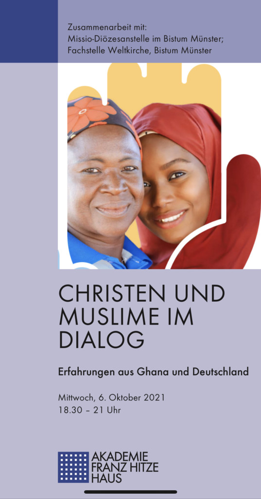 Am Beispiel von Ghana und Deutschland wollen wir die Weltkirche als Lerngemeinschaft erlebbar machen: Welche Erfahrungen gibt es hier im Dialog der beiden größten Religionsgemeinschaften in diesen Ländern? Unter welchen Bedingungen kann dieser Dialog gelingen – wo liegen die Herausforderungen und Schwierigkeiten? Wie gelingt der Dialog auf verschiedenen Ebenen: zwischen den offiziellen Vertreter:innen der Gemeinschaften, im Alltag zwischen den Menschen oder in den Schulen?